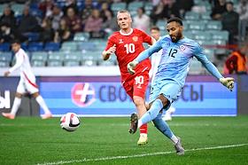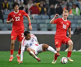 BetBoom - Товарищеский матч по футболу между сборными командами России и Чили на стадионе "Фишт". Игроки сборной России Мингиян Бевеев (слева) и Матвей Кисляк (справа) во время матча.