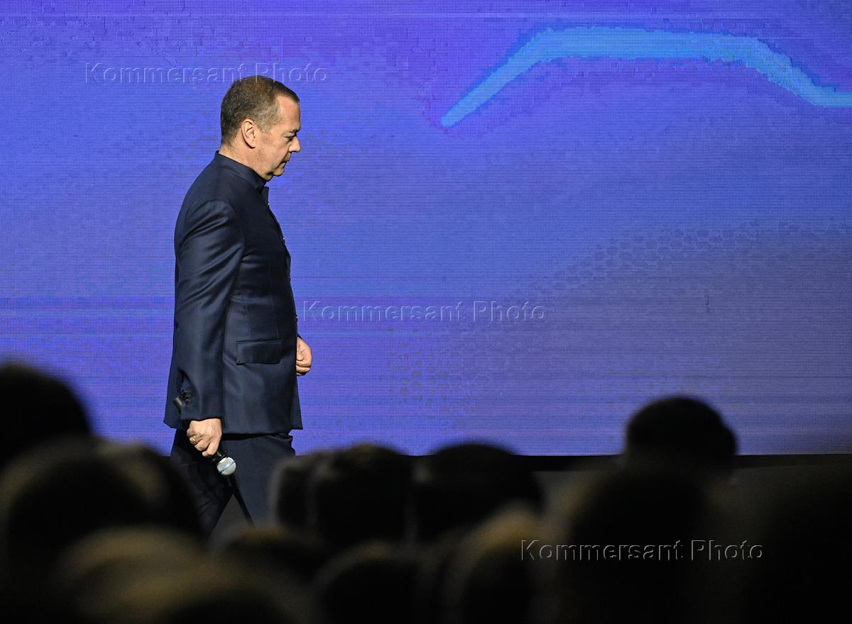 Всероссийский слет активистов молодежной организации "Молодая Гвардия", посвященный 20-летию молодежного крыла партии "Единая Россия", в "МТС Live Холл". Председатель политической партии "Единая Россия", заместитель председателя Совета безопасности России Дмитрий Медведев (слева) во время слета.