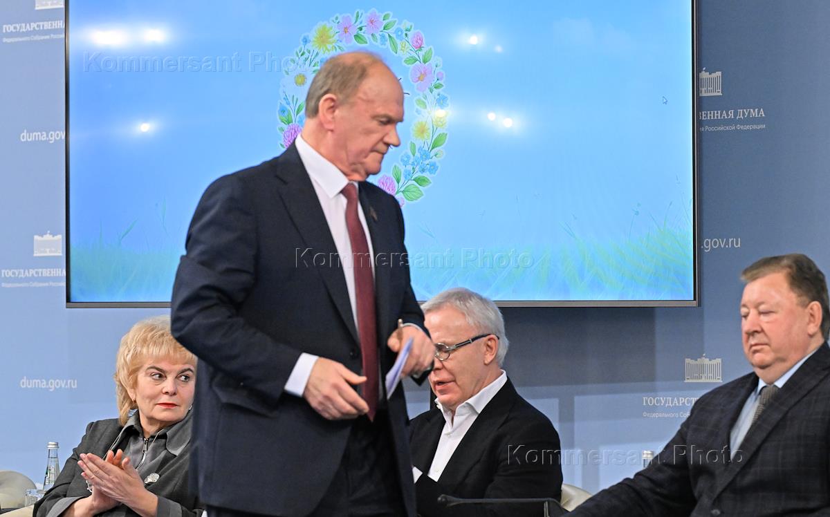 Заседание "круглого стола" на тему: "Законодательное регулирование развития биотехнологий в Российской Федерации. Агроэкологический аспект" с участием председателя ЦК КПРФ, руководителя фракции КПРФ в Государственной думе (ГД) России Геннадия Зюганова в ГД России. Жанровая фотография. Пресс-вол.