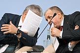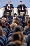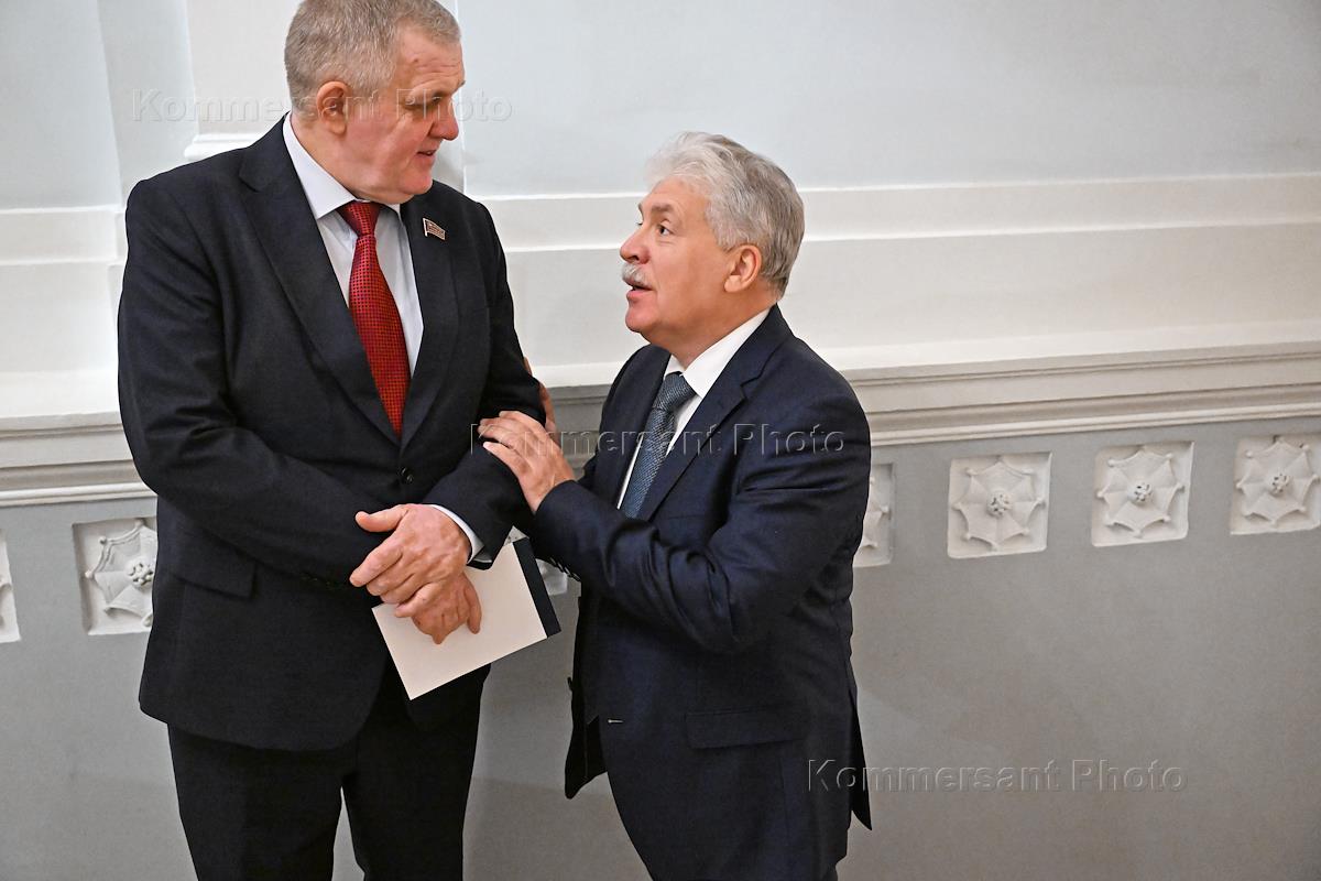 Заседание "круглого стола" на тему: "Законодательное регулирование развития биотехнологий в Российской Федерации. Агроэкологический аспект" с участием председателя ЦК КПРФ, руководителя фракции КПРФ в Государственной думе (ГД) России Геннадия Зюганова в ГД России. Первый заместитель председателя комитета ГД России по труду, социальной политике и делам ветеранов Николай Коломейцев (слева) и директор ЗАО "Совхоз имени Ленина" Павел Грудинин (справа) во время заседания.