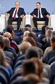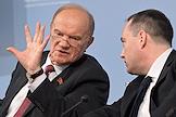 Заседание "круглого стола" на тему: "Законодательное регулирование развития биотехнологий в Российской Федерации. Агроэкологический аспект" с участием председателя ЦК КПРФ, руководителя фракции КПРФ в Государственной думе (ГД) России Геннадия Зюганова в ГД России. Лидер КПРФ, руководитель фракции КПРФ в ГД России Геннадий Зюганов (слева) и руководитель общественного экологического движения "Альянс Зеленых", председатель Общественного совета Министерства природных ресурсов и экологии России Александр Закондырин (справа) во время заседания.