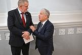 Заседание "круглого стола" на тему: "Законодательное регулирование развития биотехнологий в Российской Федерации. Агроэкологический аспект" с участием председателя ЦК КПРФ, руководителя фракции КПРФ в Государственной думе (ГД) России Геннадия Зюганова в ГД России. Директор ЗАО "Совхоз имени Ленина" Павел Грудинин (слева) и первый заместитель председателя комитета ГД по труду, социальной политике и делам ветеранов Николай Коломейцев (справа) во время заседания.