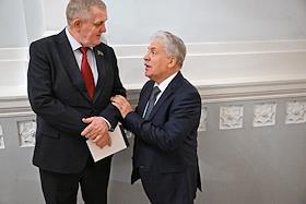 Заседание "круглого стола" на тему: "Законодательное регулирование развития биотехнологий в Российской Федерации. Агроэкологический аспект" с участием председателя ЦК КПРФ, руководителя фракции КПРФ в Государственной думе (ГД) России Геннадия Зюганова в ГД России. Слева направо: председатель комитета ГД России по развитию Дальнего Востока и Арктики Николай Харитонов и первый заместитель председателя комитета ГД России по экологии, природным ресурсам и охране окружающей среды Вячеслав Фетисов во время заседания.