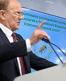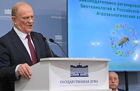 Заседание "круглого стола" на тему: "Законодательное регулирование развития биотехнологий в Российской Федерации. Агроэкологический аспект" с участием председателя ЦК КПРФ, руководителя фракции КПРФ в Государственной думе (ГД) России Геннадия Зюганова в ГД России. Лидер КПРФ, руководитель фракции КПРФ в ГД России Геннадий Зюганов во время заседания.