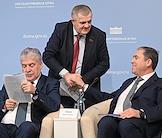 Заседание "круглого стола" на тему: "Законодательное регулирование развития биотехнологий в Российской Федерации. Агроэкологический аспект" с участием председателя ЦК КПРФ, руководителя фракции КПРФ в Государственной думе (ГД) России Геннадия Зюганова в ГД России. Слева направо: заместитель председателя комитета ГД России по экологии, природным ресурсам и охране окружающей среды Олег Лебедев, председатель комитета ГД России по развитию Дальнего Востока и Арктики Николай Харитонов и первый заместитель председателя комитета ГД России по экологии, природным ресурсам и охране окружающей среды Вячеслав Фетисов во время заседания.