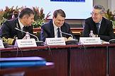 Транспортная неделя 2025. XIX Международный форум "Транспорт России". Всероссийский круглый стол "Россия – речная транспортная держава" в Торгово-промышленной палате. Слева направо: руководитель Федерального агентства морского и речного транспорта (Росморречфлот) Андрей Тарасенко, советник президента России, спецпредставитель президента России по международному сотрудничеству в сфере транспорта Игорь Левитин и президент Союза транспортников России, член комитета Государственной думы России по транспорту и развитию транспортной инфраструктуры Виталий Ефимов во время мероприятия.