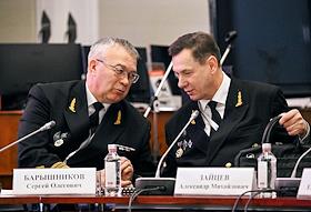 Транспортная неделя 2025. XIX Международный форум "Транспорт России". Всероссийский круглый стол "Россия – речная транспортная держава" в Торгово-промышленной палате. Ректор Государственного университета морского и речного флота имени адмирала С.О.Макарова Сергей Барышников (слева) и президент Ассоциации портов и судовладельцев речного транспорта Александр Зайцев (справа) во время мероприятия.