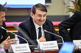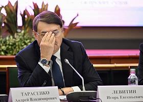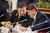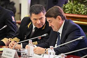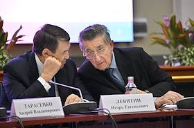 Транспортная неделя 2025. XIX Международный форум "Транспорт России". Всероссийский круглый стол "Россия – речная транспортная держава" в Торгово-промышленной палате. Руководитель Федерального агентства морского и речного транспорта (Росморречфлот) Андрей Тарасенко (слева) и советник президента России, спецпредставитель президента России по международному сотрудничеству в сфере транспорта Игорь Левитин (справа) во время мероприятия.