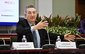 Транспортная неделя 2025. XIX Международный форум "Транспорт России". Всероссийский круглый стол "Россия – речная транспортная держава" в Торгово-промышленной палате. Советник президента России, спецпредставитель президента России по международному сотрудничеству в сфере транспорта Игорь Левитин во время мероприятия.