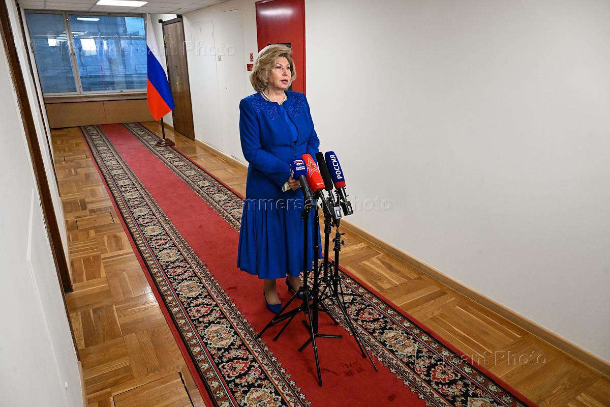 Заседание комитета Государственной думы (ГД) России по молодежной политике совместно с Уполномоченным по правам человека в России Татьяной Москальковой в ГД России. Уполномоченный по правам человека в России Татьяна Москалькова во время пресс-подхода перед началом заседания.