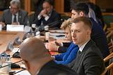 Заседание комитета Государственной думы (ГД) России по молодежной политике совместно с Уполномоченным по правам человека в России Татьяной Москальковой в ГД России. Начальник отдела строительной дорожной и коммунальной техники Министерства промышленности и торговли России Станислав Черторыжский (слева) и заместитель директора департамента развития и регулирования юридической помощи и правовых услуг Министерства юстиции России Антон Бенов (второй слева) во время заседания.