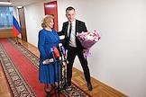 Заседание комитета Государственной думы (ГД) России по молодежной политике совместно с Уполномоченным по правам человека в России Татьяной Москальковой в ГД России. Уполномоченный по правам человека в России Татьяна Москалькова (слева) и председатель комитета ГД России по молодежной политике Артем Метелев (справа) во время пресс-подхода перед началом заседания.
