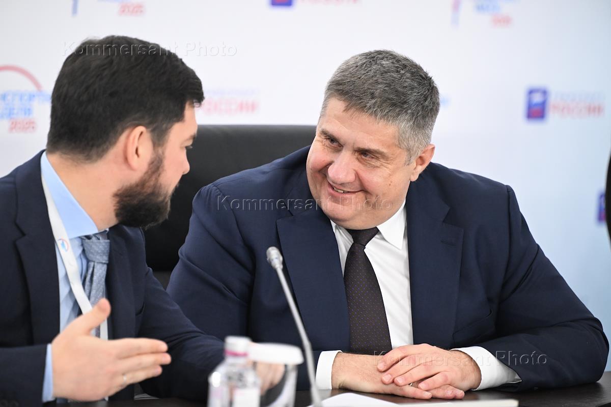 Транспортная неделя 2025. XIX Международный форум и выставка "Транспорт России" в Гостином дворе. Заместитель директора Департамента строительства правительства России Григорий Волков (слева) и руководитель Федерального дорожного агентства Роман Новиков на форуме.