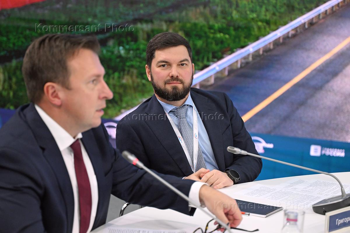 Transport Week 2025. 19th International Forum and Exhibition "Transport of Russia" at Gostiny Dvor. Grigory Volkov (left), Deputy Director of the Russian Government's Construction Department, and Roman Novikov, Head of the Federal Road Agency, at the forum.