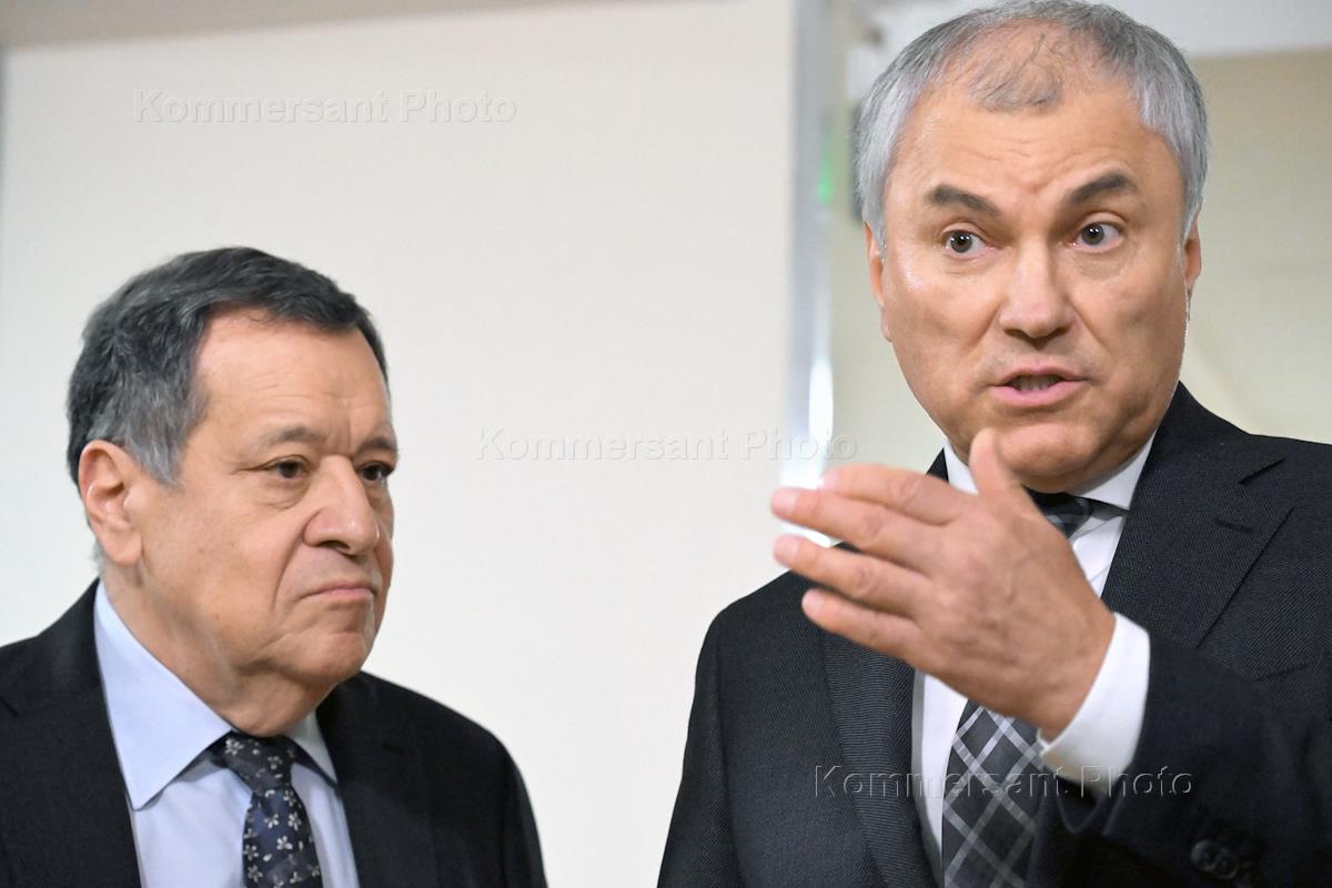 Пленарное заседание Государственной думы (ГД) России. Председатель комитета ГД России по бюджету и налогам Андрей Макаров (слева) и председатель ГД России Вячеслав Володин (справа) во время заседания.