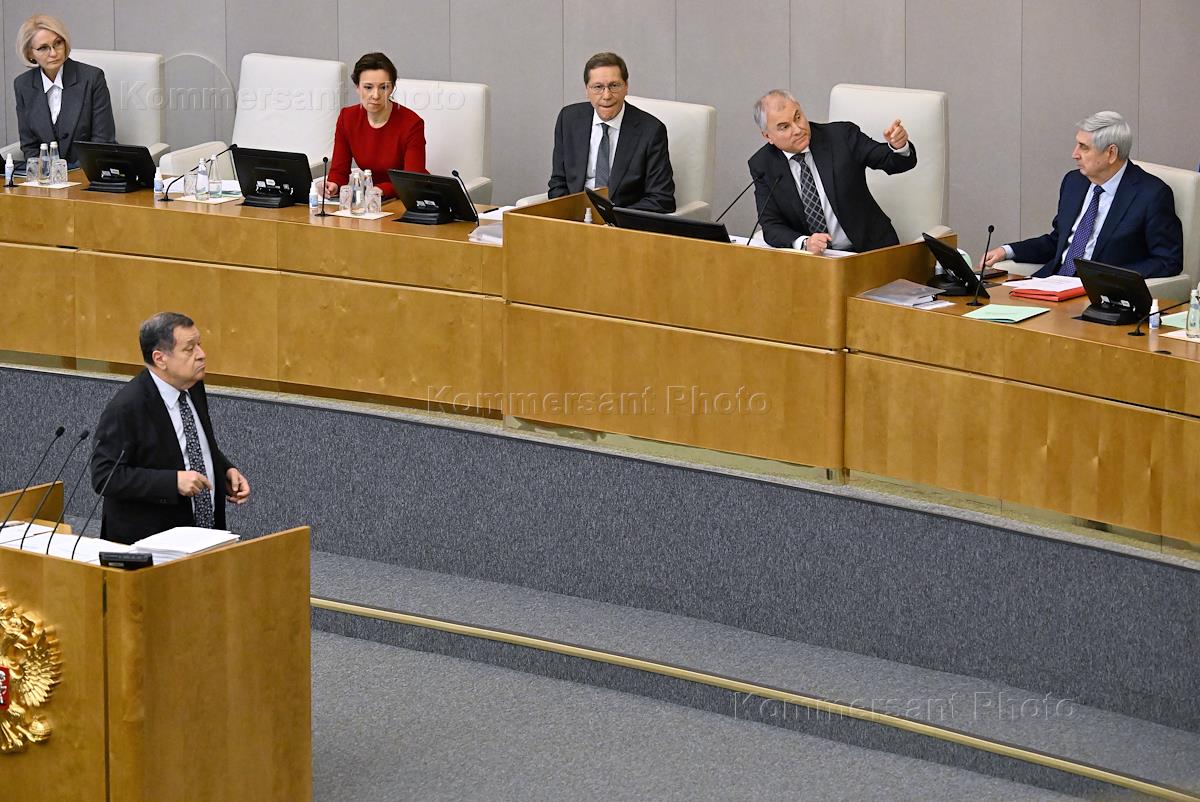 Пленарное заседание Государственной думы (ГД) России. Заместитель председателя комитета ГД России по экологии, природным ресурсам и охране окружающей среды Олег Лебедев (в центре) во время заседания.