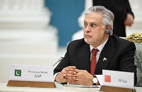 Встреча президента России Владимир Путина с главами делегаций, участниками заседания Совета глав правительств государств-членов Шанхайской организации сотрудничества (ШОС) в Екатерининском зале Сенатского дворца Кремля. Заместитель премьер-министра, министр иностранных дел Пакистана Мухаммад Исхак Дар во время встречи.