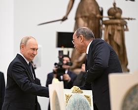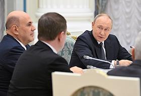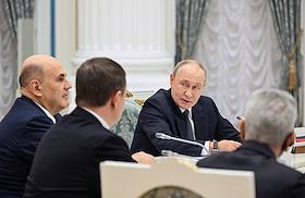 Встреча президента России Владимир Путина с главами делегаций, участниками заседания Совета глав правительств государств-членов Шанхайской организации сотрудничества (ШОС) в Екатерининском зале Сенатского дворца Кремля. Президент России Владимир Путин (в центре) и председатель правительства России Михаил Мишустин (слева) во время встречи.