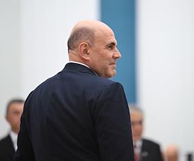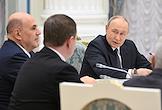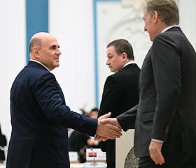 Встреча президента России Владимир Путина с главами делегаций, участниками заседания Совета глав правительств государств-членов Шанхайской организации сотрудничества (ШОС) в Екатерининском зале Сенатского дворца Кремля. Президент России Владимир Путин (справа) и председатель правительства России Михаил Мишустин (слева) во время встречи.