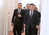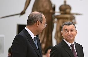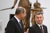Встреча президента России Владимир Путина с главами делегаций, участниками заседания Совета глав правительств государств-членов Шанхайской организации сотрудничества (ШОС) в Екатерининском зале Сенатского дворца Кремля. Премьер-министр Узбекистана Абдулла Арипов (слева) и премьер-министр Таджикистана Кохир Расулзода (справа) во время встречи.
