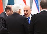 Встреча президента России Владимир Путина с главами делегаций, участниками заседания Совета глав правительств государств-членов Шанхайской организации сотрудничества (ШОС) в Екатерининском зале Сенатского дворца Кремля. Председатель правительства России Михаил Мишустин (в центре) во время встречи.
