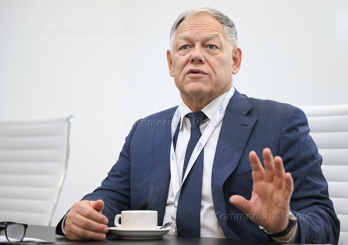 Транспортная неделя 2025 в Гостином дворе. Председатель правления ГК "Автодор" Вячеслав Петушенко во время интервью. Жанровая фотография.