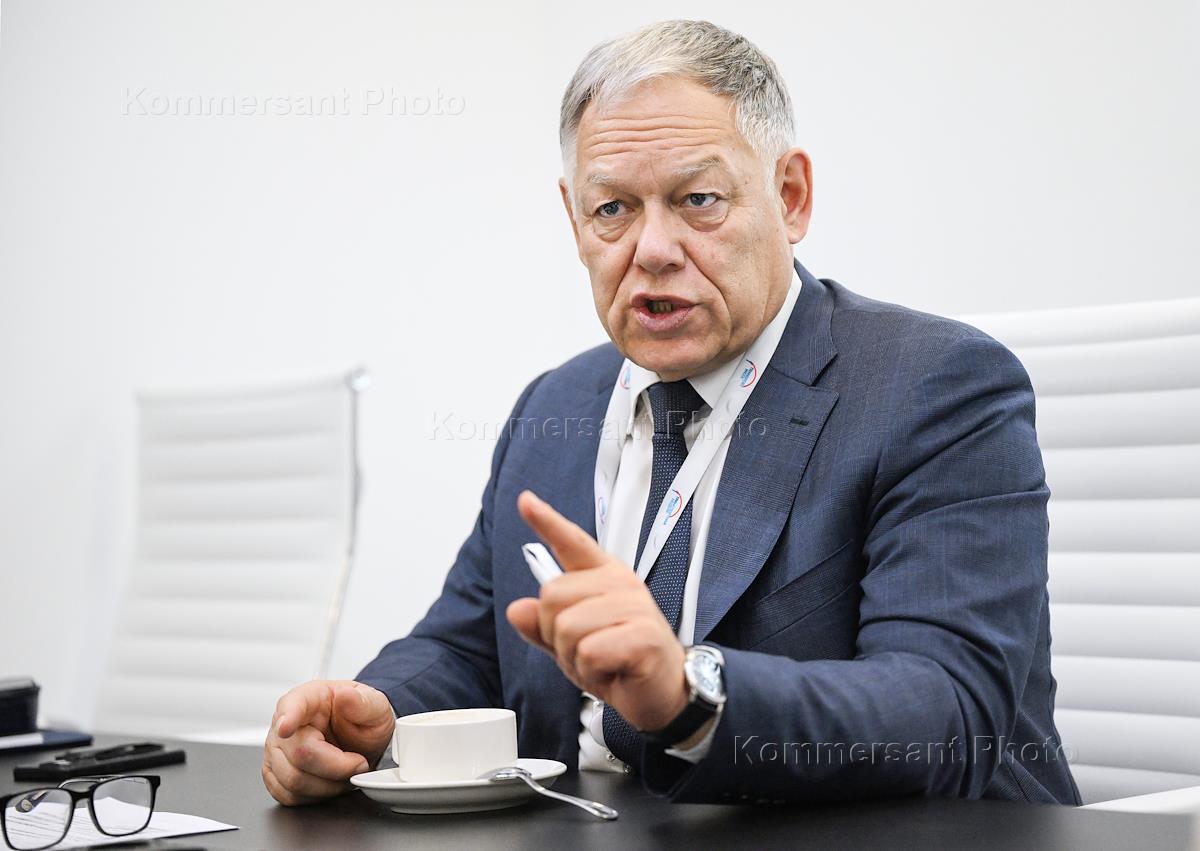 Транспортная неделя 2025 в Гостином дворе. Председатель правления ГК "Автодор" Вячеслав Петушенко во время интервью. Жанровая фотография.