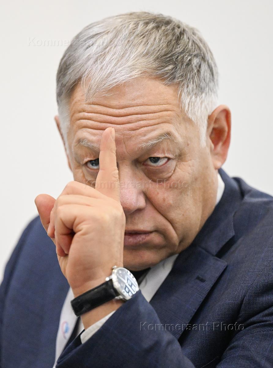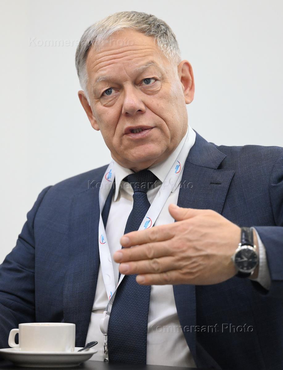 Транспортная неделя 2025 в Гостином дворе. Председатель правления ГК "Автодор" Вячеслав Петушенко во время интервью. Жанровая фотография.