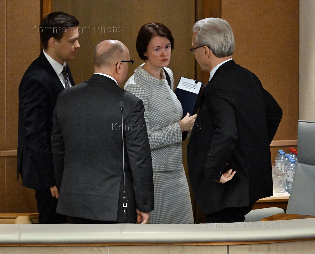 Plenary session of the State Duma of Russia. State Secretary and Deputy Minister of Justice of Russia Elena Ardabyeva (second from right) and Plenipotentiary Representative of the President of Russia to the State Duma Garry Minkh (right) during the session.