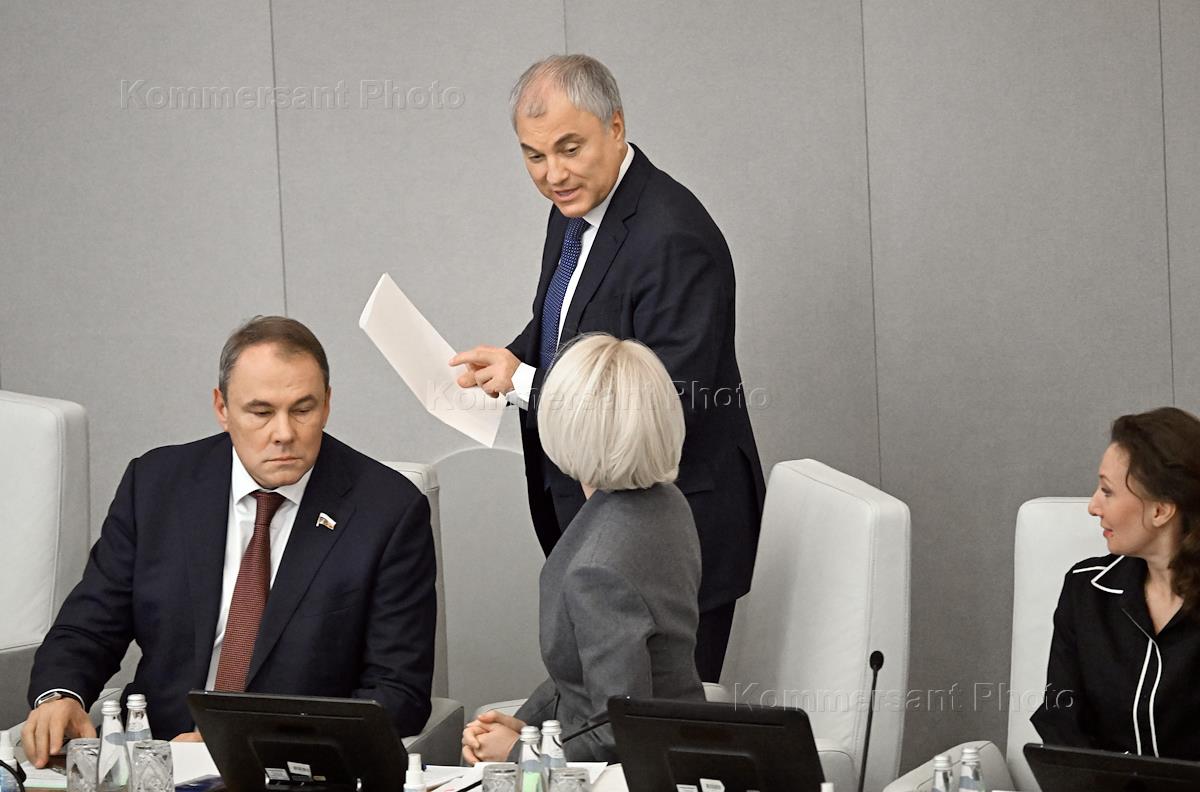 Пленарное заседание Государственной думы (ГД) России. Председатель ГД России Вячеслав Володин (слева) и заместитель председателя комиссии ГД России по Регламенту и обеспечению деятельности Государственной Думы Раиса Кармазина (справа) во время заседания.