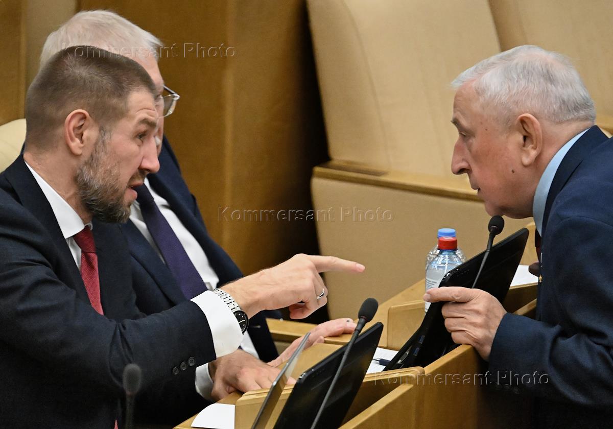 Пленарное заседание Государственной думы (ГД) России. Первый заместитель председателя комитета ГД России по физической культуре и спорту Дмитрий Пирог (слева) и председатель комитета ГД России по развитию Дальнего Востока и Арктики Николай Харитонов (справа) во время заседания.