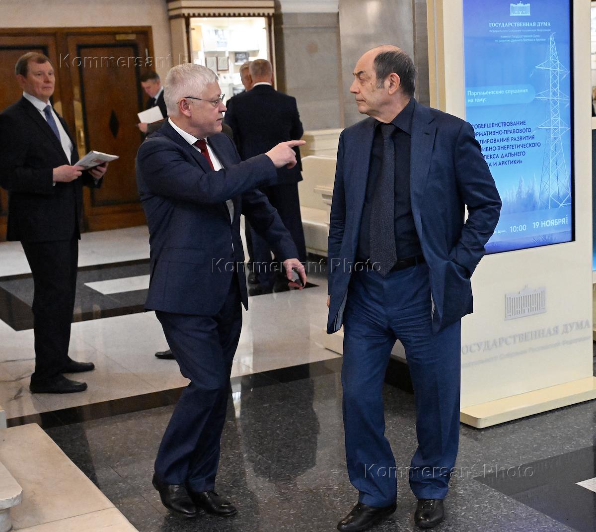 Plenary session of the State Duma of Russia. Chairman of the State Duma Committee on Science and Higher Education Sergei Kabyshev (center) and Presidential Plenipotentiary Envoy to the State Duma Garry Minkh (left) during the session.