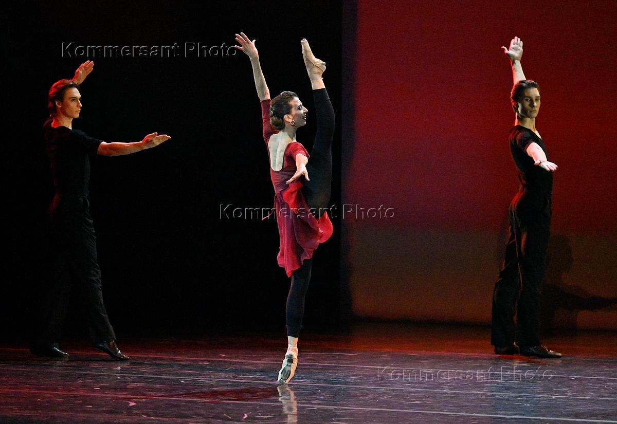 The premiere of the ballet "Maya. Suite of Love" for the 100th anniversary of Maya Plisetskaya's birth, directed by Igor Teplov and choreographed by Victoria Litvinova, at the State Kremlin Palace. The ballet "Ballet Class" features music by composer Alexander Simonenko. Ballet dancers Anastasia Limenko (center) and Vladislav Lantratov (left) perform.