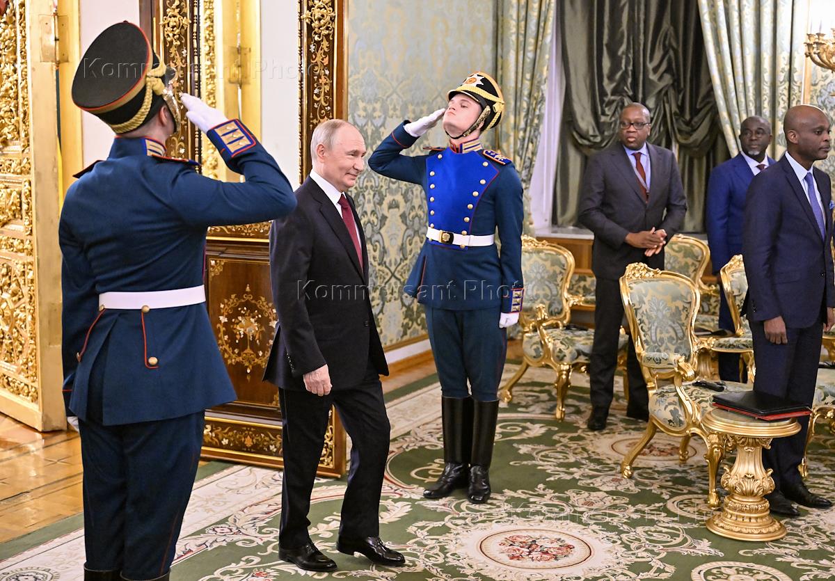 Встреча президента России Владимира Путина и председателя Совета министров Тоголезской Республики Фора Гнассингбе в зеленой гостиной Большого Кремлевского дворца. Члены делегации Тоголезской Республики перед началом встречи.