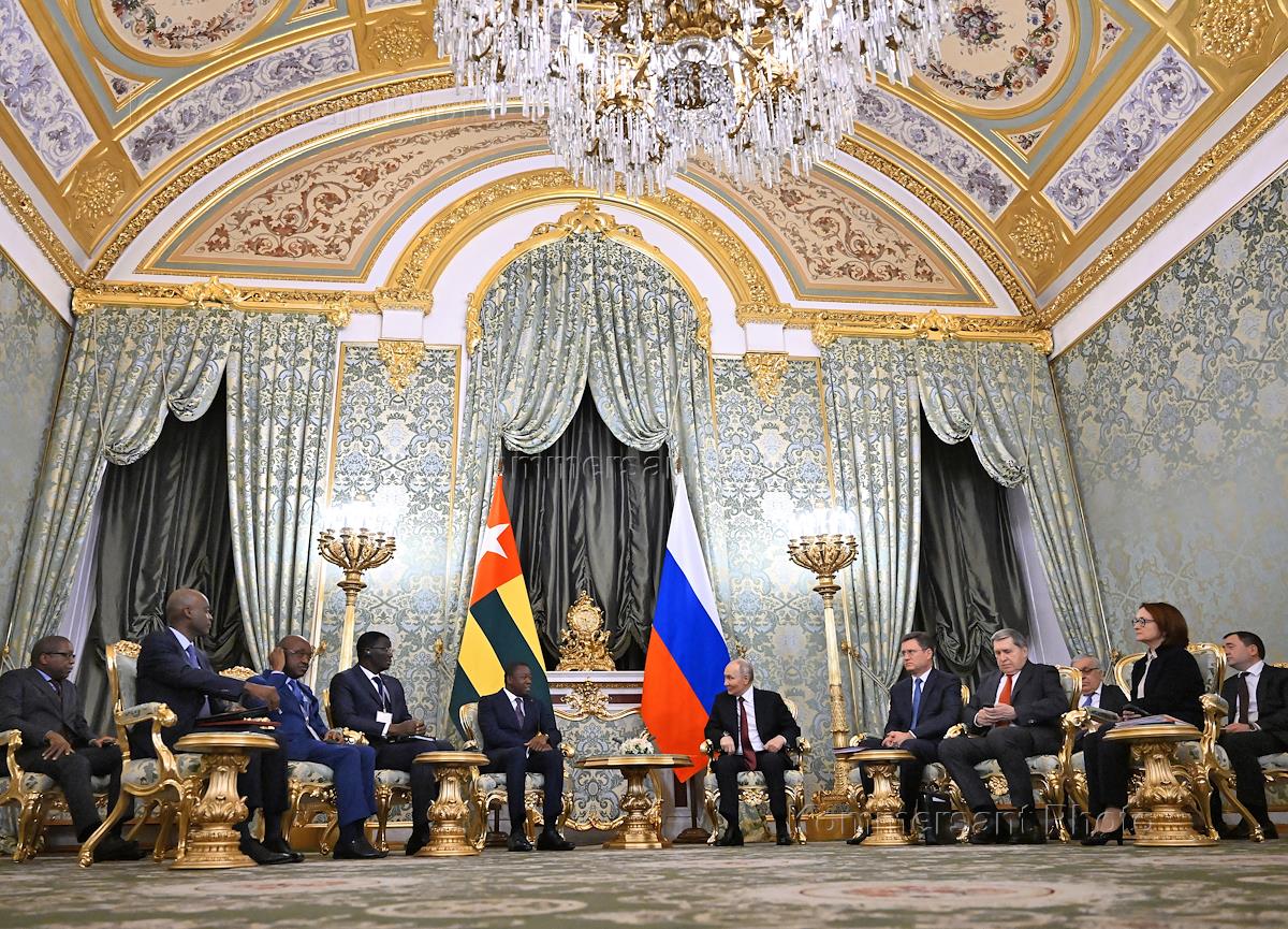 Встреча президента России Владимира Путина и председателя Совета министров Тоголезской Республики Фора Гнассингбе в зеленой гостиной Большого Кремлевского дворца. Слева направо: председатель Совета министров Тоголезской Республики Фор Гнассингбе, президент России Владимир Путин, заместитель председателя правительства России Александр Новак, помощник президента России Юрий Ушаков, заместитель министра иностранных дел России Сергей Вершинин и председатель Центрального Банка России Эльвира Набиуллина во время встречи.