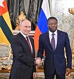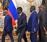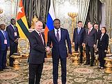 Встреча президента России Владимира Путина и председателя Совета министров Тоголезской Республики Фора Гнассингбе в зеленой гостиной Большого Кремлевского дворца. Слева направо: председатель Совета министров Тоголезской Республики Фор Гнассингбе, президент России Владимир Путин, заместитель председателя правительства России Александр Новак, помощник президента России Юрий Ушаков, заместитель министра иностранных дел России Сергей Вершинин и председатель Центрального Банка России Эльвира Набиуллина во время встречи.