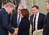 Встреча президента России Владимира Путина и председателя Совета министров Тоголезской Республики Фора Гнассингбе в зеленой гостиной Большого Кремлевского дворца. Слева направо: заместитель руководителя администрации президента России, пресс-секретарь президента Дмитрий Песков, председатель Центрального Банка России Эльвира Набиуллина, председатель ПАО "Промсвязьбанк" Петр Фрадков и помощник президента России Юрий Ушаков перед началом встречи.