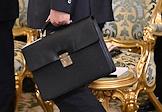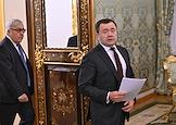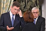 Встреча президента России Владимира Путина и председателя Совета министров Тоголезской Республики Фора Гнассингбе в зеленой гостиной Большого Кремлевского дворца. Председатель ПАО "Промсвязьбанк" Петр Фрадков (слева) и заместитель председателя правительства России Александр Новак (справа) перед началом встречи.