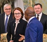 Встреча президента России Владимира Путина и председателя Совета министров Тоголезской Республики Фора Гнассингбе в зеленой гостиной Большого Кремлевского дворца. Слева направо: заместитель председателя правительства России Александр Новак, председатель Центрального Банка России Эльвира Набиуллина и заместитель министра иностранных дел России Сергей Вершинин перед началом встречи.