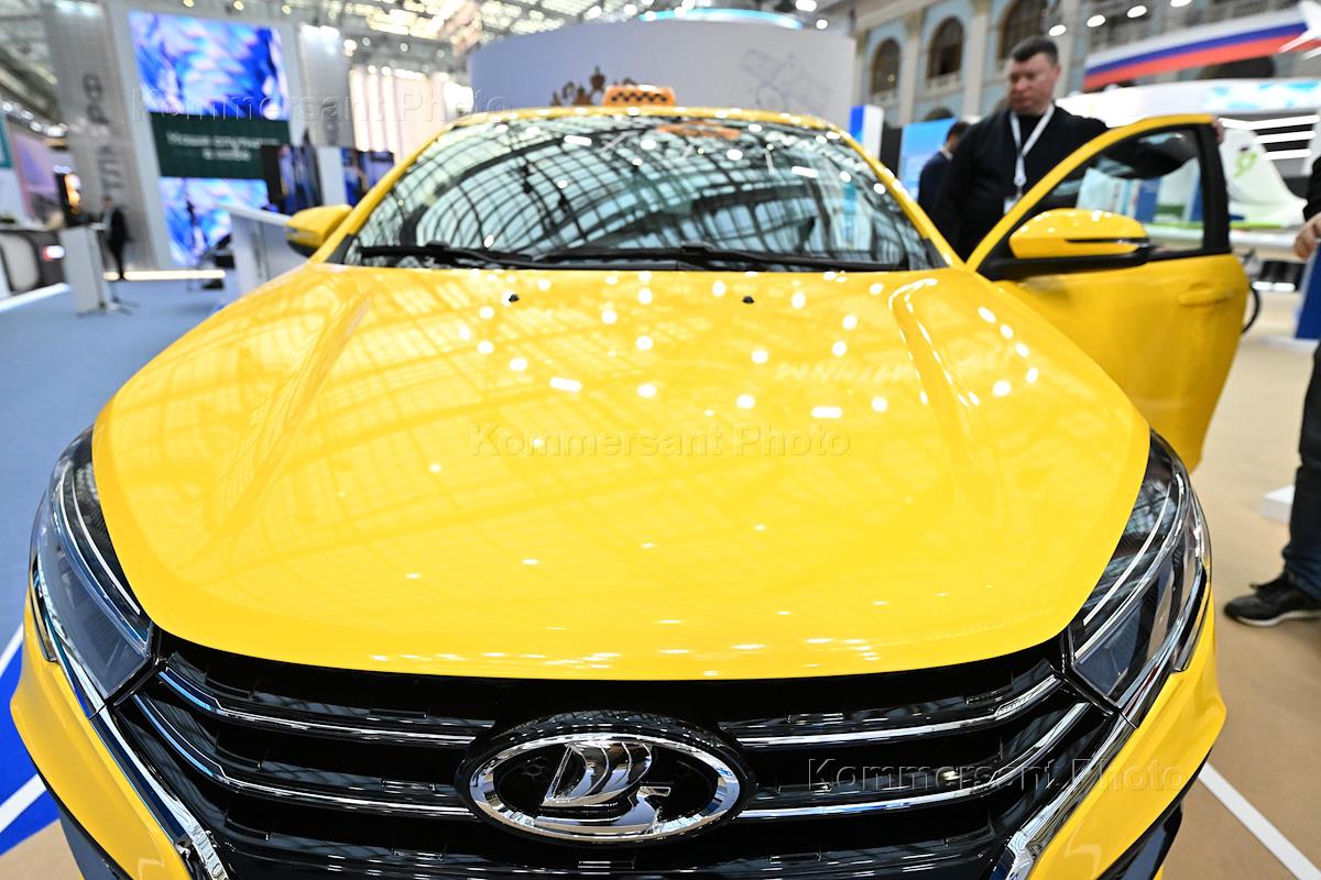 Транспортная неделя 2025. XIX Международный форум и выставка "Транспорт России" в Гостином дворе. Стенд автомобиля "Lada Aura" для такси на выставке.