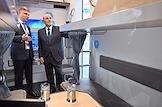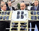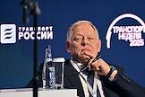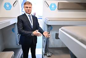 Транспортная неделя 2025. XIX Международный форум и выставка "Транспорт России" в Гостином дворе. Генеральный директор - председатель правления ОАО "РЖД" Олег Белозеров во время осмотра макета плацкартного вагона поезда на выставке.