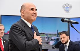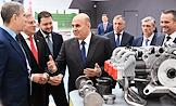 Транспортная неделя 2025. XIX Международный форум и выставка "Транспорт России" в Гостином дворе. Председатель правительства России Михаил Мишустин (слева) на выставке.