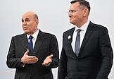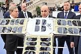 Транспортная неделя 2025. XIX Международный форум и выставка "Транспорт России" в Гостином дворе. Председатель правительства России Михаил Мишустин (в центре) и его заместители Виталий Савельев (слева) и Марат Хуснуллин (второй справа) во время осмотра выставки.