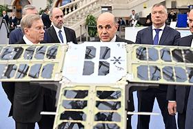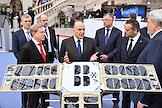 Транспортная неделя 2025. XIX Международный форум и выставка "Транспорт России" в Гостином дворе. Председатель правительства России Михаил Мишустин (в центре), его заместители Виталий Савельев (второй слева), Марат Хуснуллин (третий справа), руководитель Федерального агентства воздушного транспорта (Росавиации) Дмитрий Ядров (третий слева), министр транспорта России Андрей Никитин (справа) и генеральный директор S7 AirSpace Corporation Владислав Филев (слева) во время осмотра авиационного двигателя АПД-520 "Лидер" на выставке.