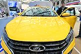 Транспортная неделя 2025. XIX Международный форум и выставка "Транспорт России" в Гостином дворе. Стенд автомобиля "Lada Aura" для такси на выставке.