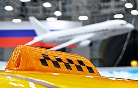 Транспортная неделя 2025. XIX Международный форум и выставка "Транспорт России" в Гостином дворе. Жанровая фотография. Макет самолета и фонарь такси на крыше автомобиля.
