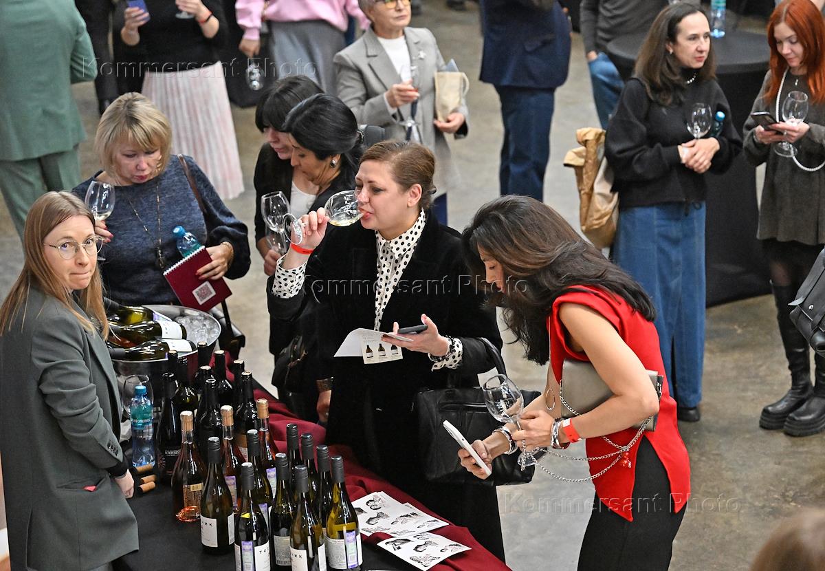 Специальный винный салон, посвященный выходу ежегодного исследования "Винный гид России" 2025-2026, в лофте Format. Жанровая фотография.