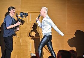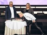 Концерт "SHAMAN. 30 лет на сцене" на сцене Государственного Кремлевского дворца. Певец SHAMAN (Ярослав Дронов) и его родители Юрий и Людмила Дроновы во время концерта.
