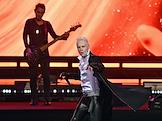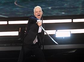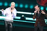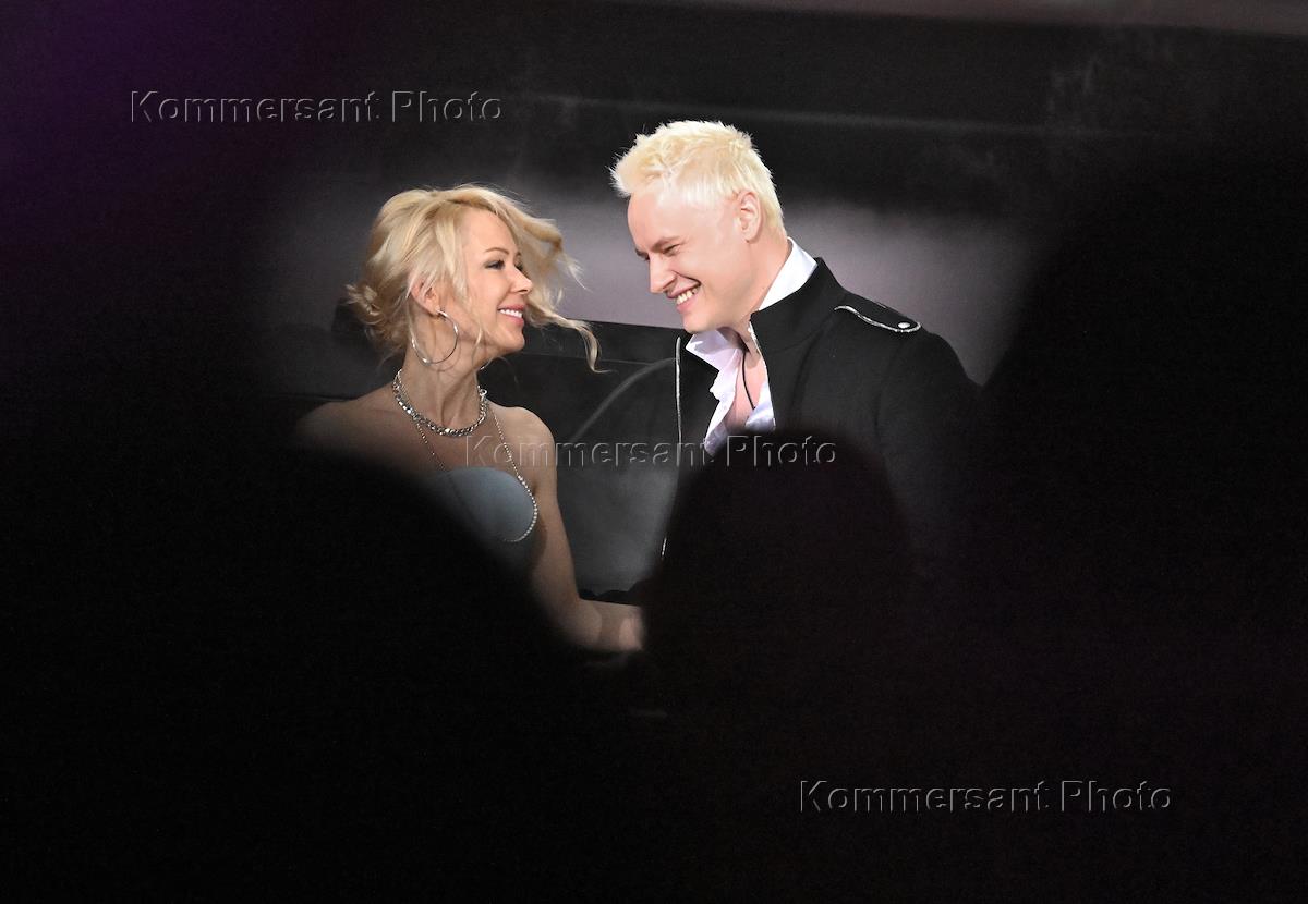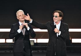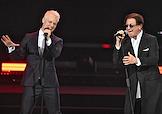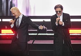 Концерт "SHAMAN. 30 лет на сцене" на сцене Государственного Кремлевского дворца. Певцы SHAMAN (Ярослав Дронов) (слева) и Григорий Лепс (справа) во время выступления.