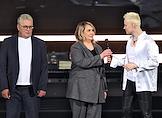 Концерт "SHAMAN. 30 лет на сцене" на сцене Государственного Кремлевского дворца. Слева направо: блогер Никита Сорокин, блогер и ведущая шоу "Мятные сплетни" Мария Урюпина (Mint Lilu), глава Лиги безопасного Интернета Екатерина Мизулина и певец SHAMAN (Ярослав Дронов) перед началом концерта.